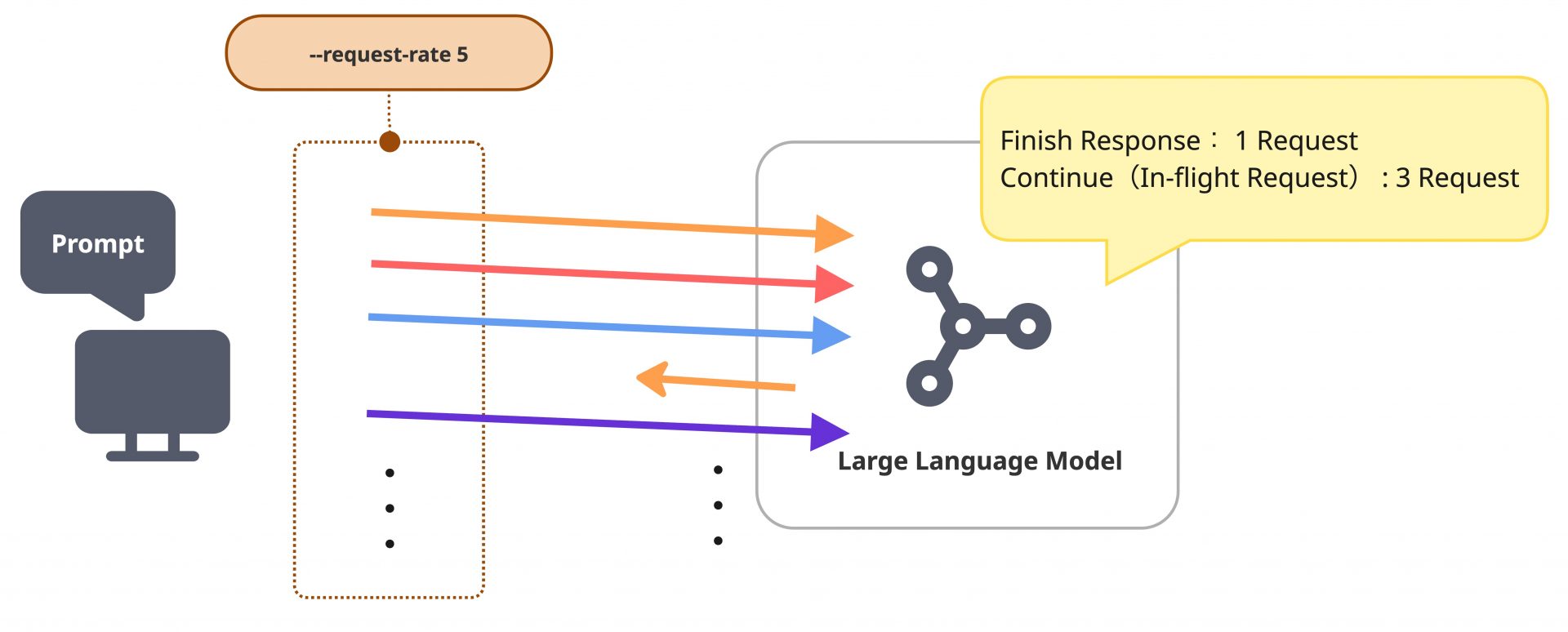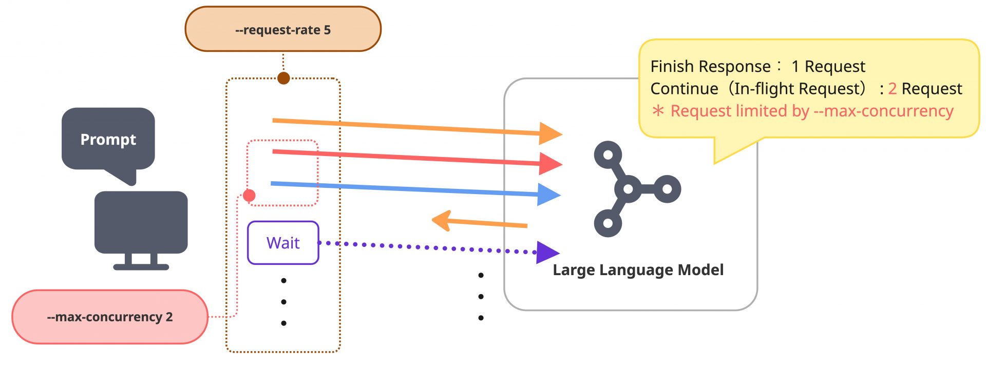 続いて、ベンチマーク全体のワークロード負荷に関するパラメータについて決定します。ここでは--request-rateと--max-concurrencyは負荷の模擬において極めて重要であり、かつ密接に連動する設定値です。--request-rateはクライアント(送信側)が指定された目標レート(RPS: Requests Per Second)に従って、一定間隔でリクエストを送信しようと試みる設定です。しかし、サーバーの処理能力がこのリクエストの到達レートに追いつかない場合、処理が完了しないリクエストはシステム内に滞留し始めます。これはクライアント側からすると、In-flightなリクエストの数が徐々に増えていくことになります。