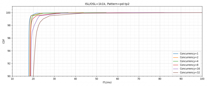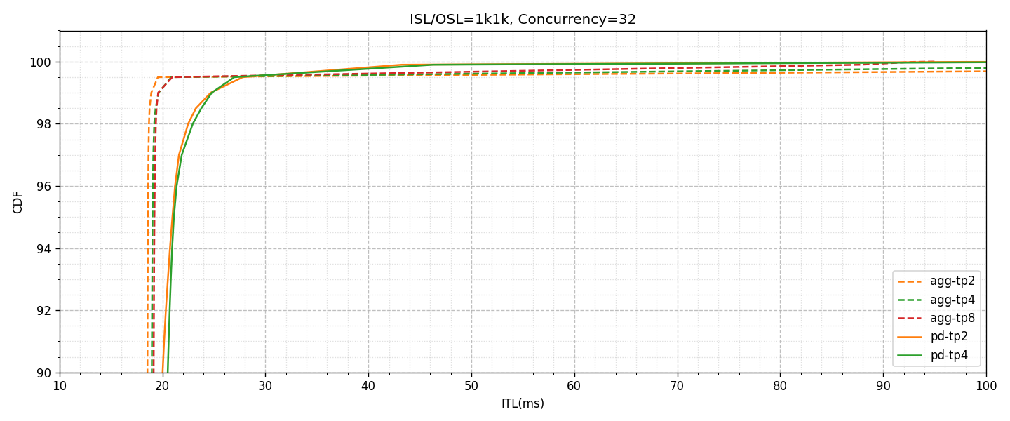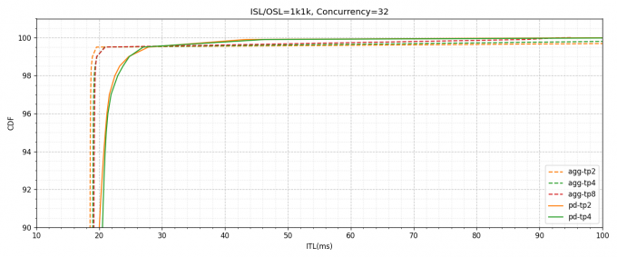 Aggregatedのグラフを見ると、同時接続数が増え、システムの負荷が上がることでITLのTail Latencyの値が低下し、例えば16並列以上になるとP99を100ms以内で満たすことができない状況になります。これに対して、PD Disaggregationの場合では、影響はあるもののかなり抑えられており、32並列であってもP99を30ms以内に抑えられるということがわかります。