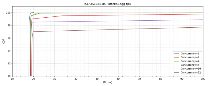 - 入力長8k・出力長1kの場合、同時接続数が増え、負荷が上昇するにつれ、AggregatedはITL Tail Latencyが悪化する一方、PD Disaggregationは性能を維持した。