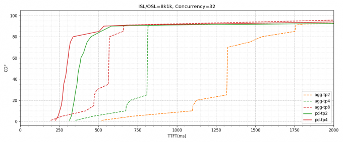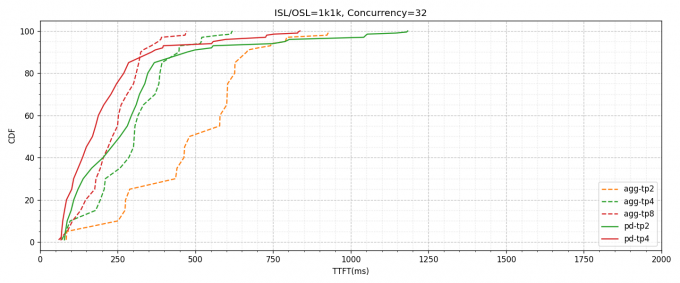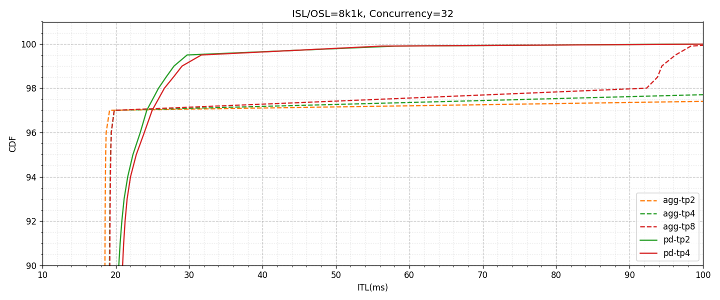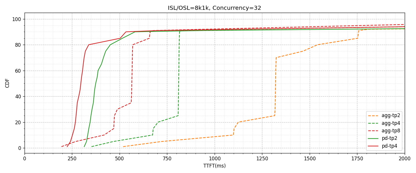 もう少し直接的に比較するために、32並列に関するAggregated、PD Disaggregationの性能を同一グラフ上にプロットします。また同条件において、GPUの利用量を変化させたものを異なる色付きのグラフで表現しています。同じGPU枚数のもの(agg-tp4とpd-tp2、agg-tp8とpd-tp4)は同じ色にしてあるため、同色での比較は同じリソース量での比較になります。