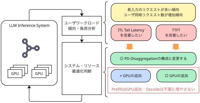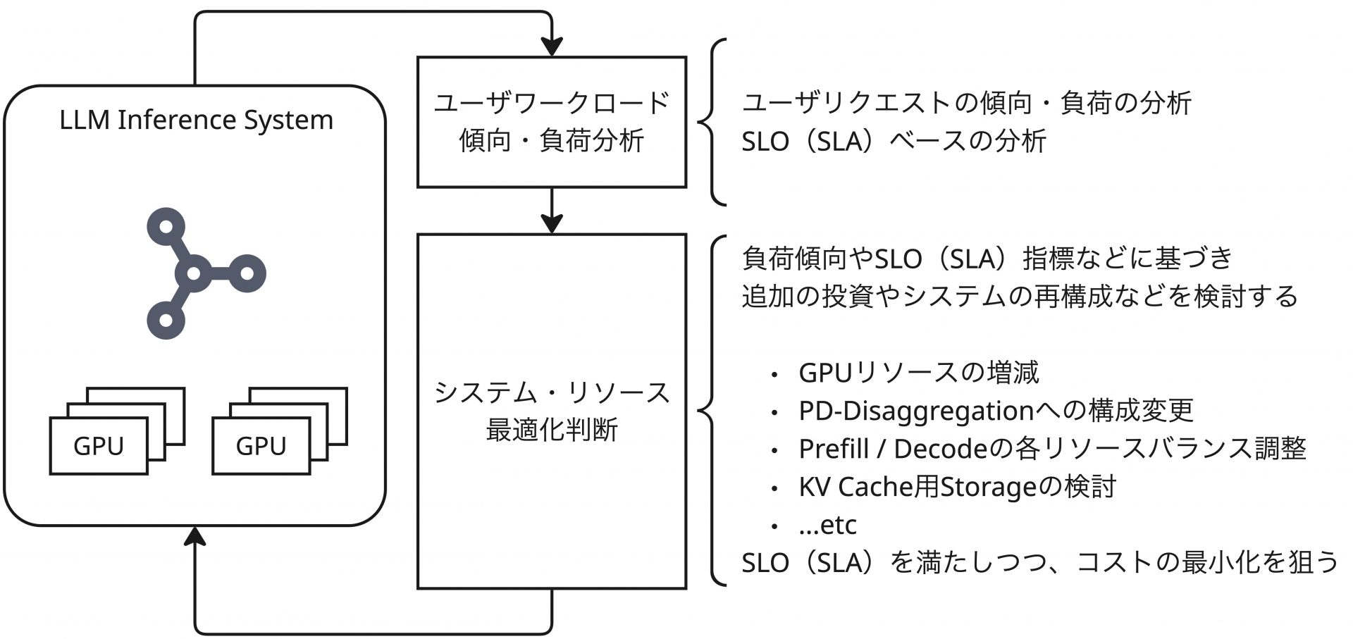 再三になりますが今回のベンチマークは負荷試験のようなワークロードを模擬しており、現実的なユーザーワークロードが必ずしも今回のような負荷傾向になるわけではありません。PD Disaggregationの効果を見るという目的としては一定の意味のある検証結果になっているとは思いますが、今回確認されたPD Disaggregationによる効果が即時的に実際のシステムに適用されるわけではありません。ユーザーリクエストの入力長などのパラメータは我々がコントロールできるものではなく、システムにかかるワークロード負荷も環境によって異なるため、最適とされる構成やリソース量は状況によって全く異なります。常にユーザーのリクエスト傾向やシステム負荷などを観測しつつ、その基盤が満たすべきSLO・SLAを実現するための情報を集め、継続的に改善するという最適化のループを回し続けるという考え方が重要です。