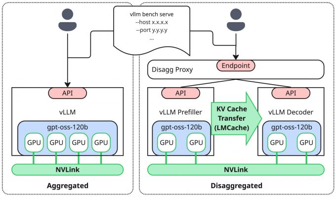 今回の検証では、PD Disaggregationの効果を比較検討するために、PD Disaggregationを採用しない構成(以降、Aggregatedと呼称)で同様のベンチマークを実施します。Aggregatedで測定する場合は、トータルで利用するGPU枚数を揃えて比較するようにしました。いずれの構成においても、上述で設計したパラメータを利用して vllm bench serve でベンチマークを実行します。