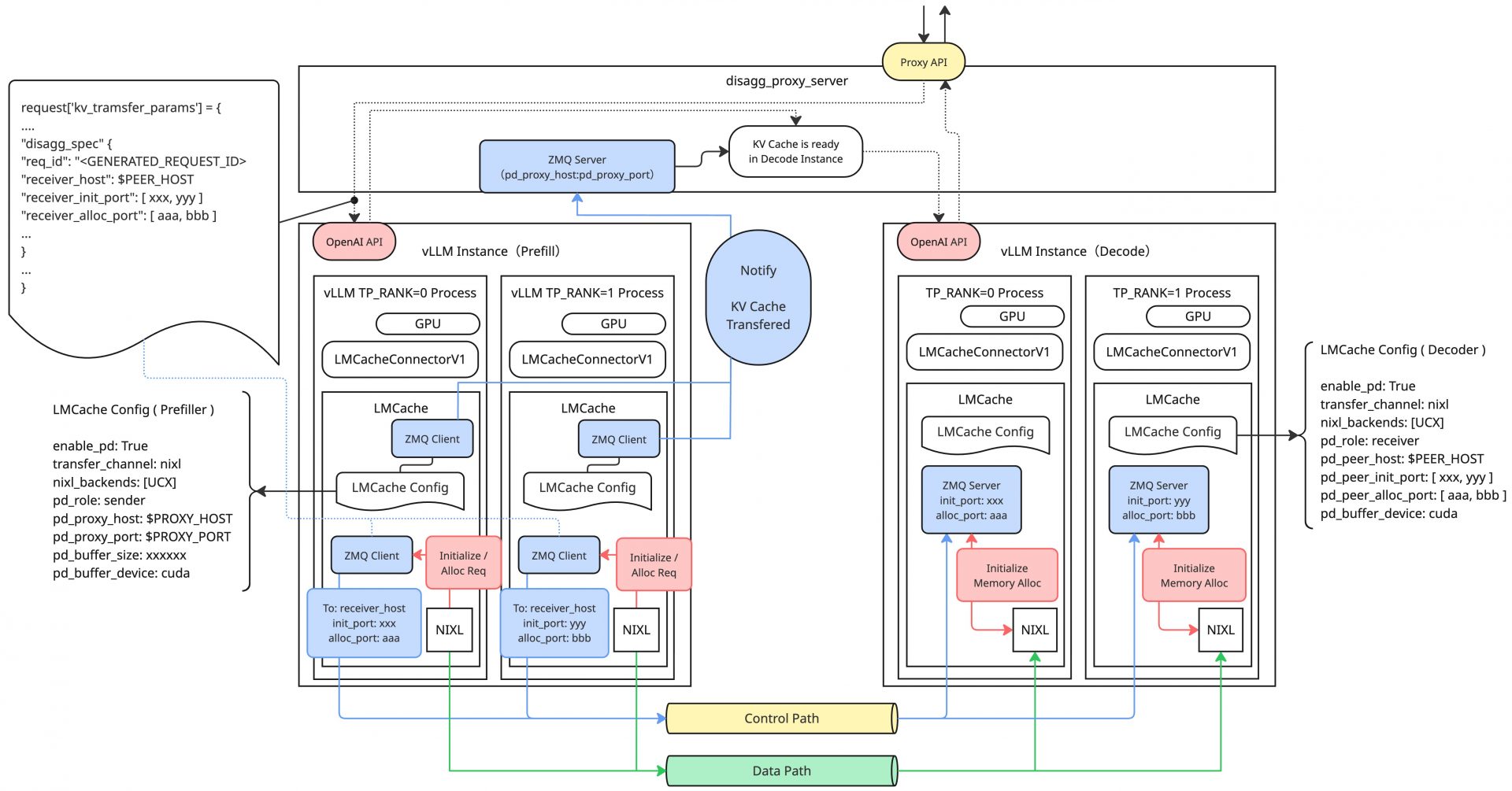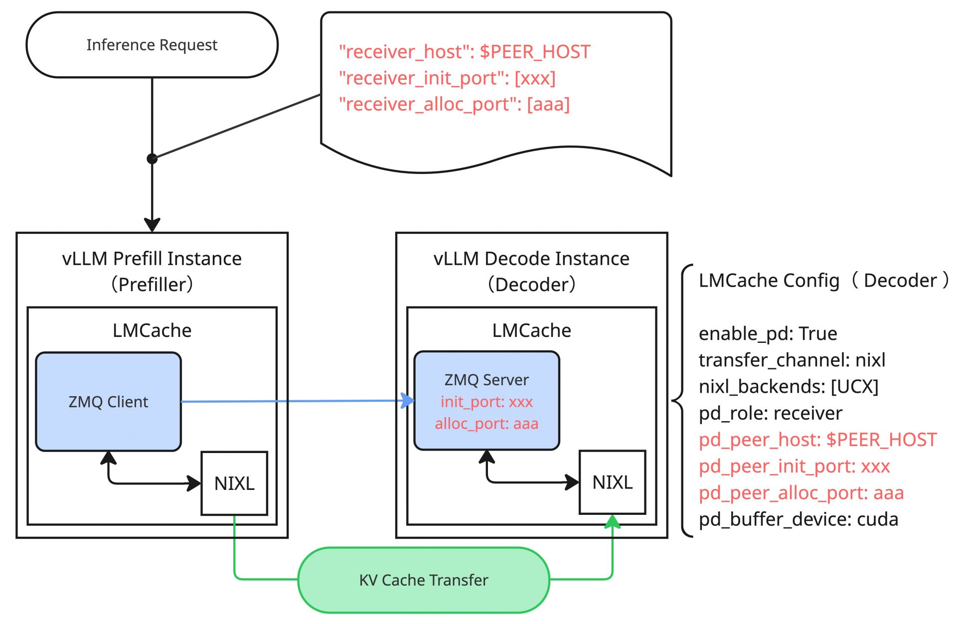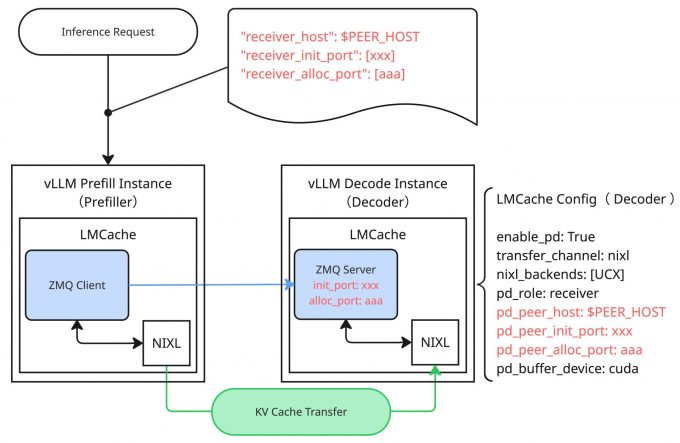 ここからは、今回の環境におけるPD Disaggregationの処理について少しだけ踏み込んで解説していきます。LMCacheによるNIXLを利用したPD Disaggregationでは、PrefillとDecode間はNIXLによってデータ転送のチャネルを貼りKV Cacheのデータ転送を行います。NIXLのデータ転送の処理の大まかなフローは前回の記事で紹介した通りであり、これをLMCacheが内部のロジックとして持っています。NIXLでは、メタデータの交換などの都合上、Prefillインスタンス(以降、Prefiller)とDecodeインスタンス(以降、Decoder)の間で通信を行う必要がありますが、LMCacheではこれをZMQを利用して実施しています。Decoder側でZMQ Serverを起動し(LMCacheの設定における、pd_peer_init_port、pd_peer_alloc_portがZMQのポート番号に該当する)、Prefiller側から接続して必要なメタデータの交換やメモリー確保要求などを行います。ただし、Prefiller側のLMCacheの設定にはDecoderのZMQに関する情報はなく、該当の情報は推論リクエスト内部に埋め込まれていることを想定します。
