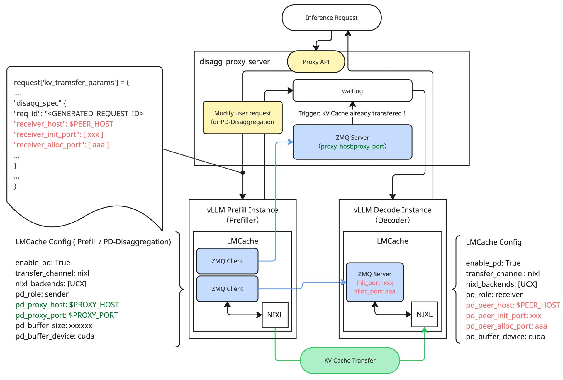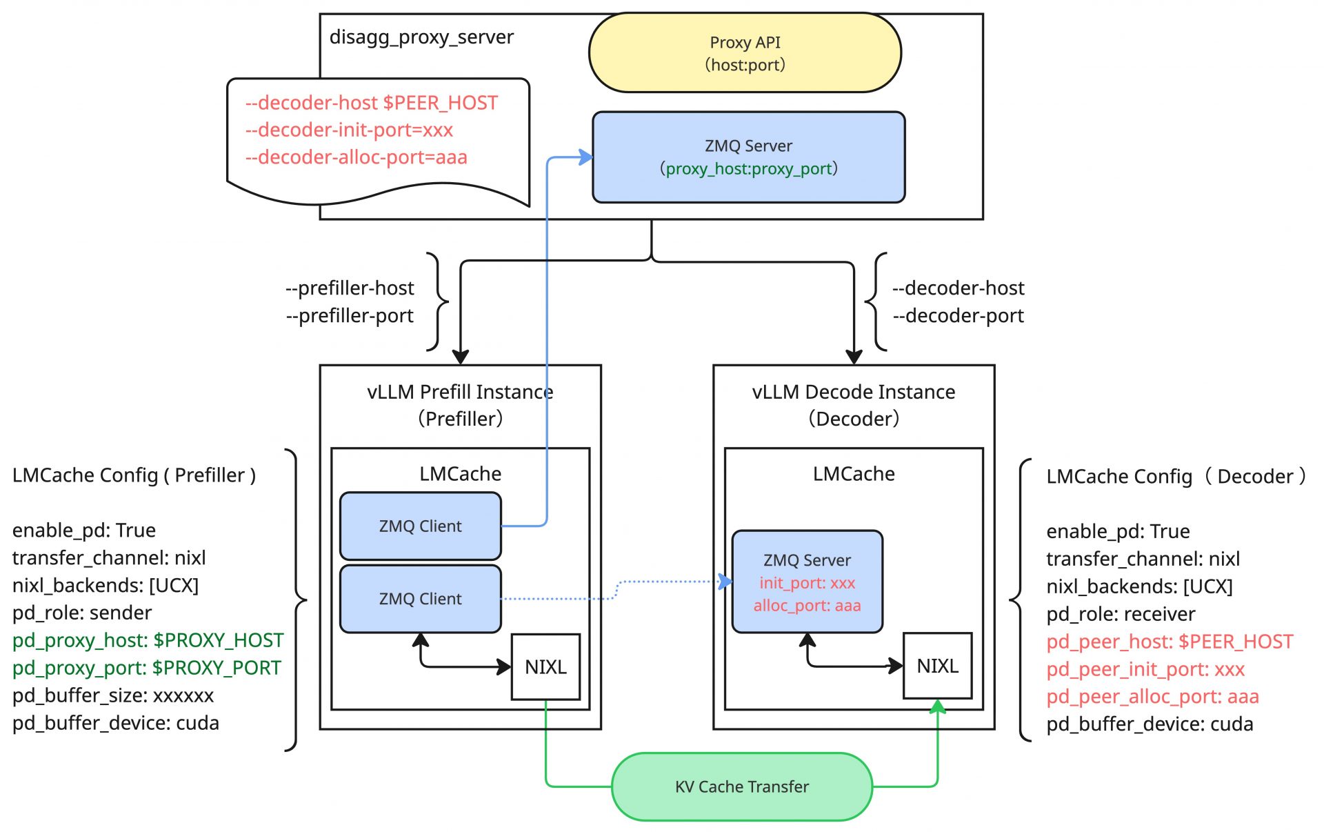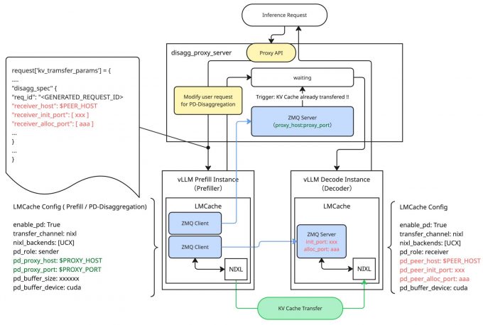 このProxyサーバーはユーザーからの推論リクエストに対するProxyとして動作するため、リクエストを転送する先のPrefillerやDecoderの接続情報を持ちます。その他に重要なこととして、起動時パラメータにある通り、ProxyサーバーはDecoder側のZMQに関する情報も持っています。また、PrefillerからKV Cacheに関する通知を受け取るために専用のZMQ Serverを内部的に起動します。Prefiller側のLMCacheの設定には、このKV Cache通知用のZMQ Serverの情報(pd_proxy_host、pd_proxy_port)を記載することになります。