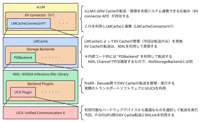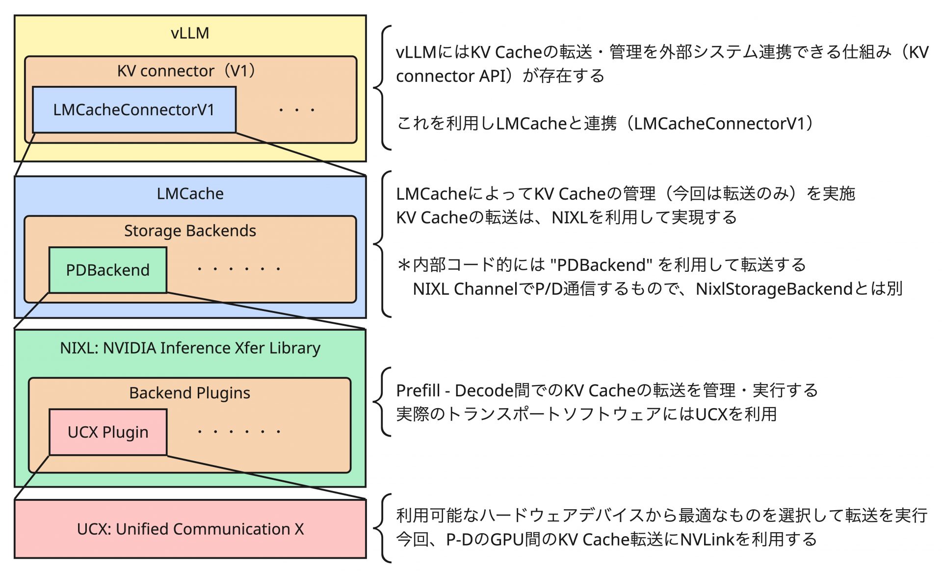 具体的には過去の連載で紹介した、UCX、NIXL、vLLMの他に、LMCacheというソフトウェアを含めた以下の構成で検証することにしました。