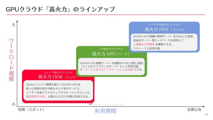 このようなGPU調達の課題に対する解決策として、さくらインターネットではGPUのホスティングサービスを3種類提供しています。物理サーバーを丸ごと貸し出す「高火力 PHY」、1GPUを専有できる仮想サーバー「高火力 VRT」、コンテナ実行環境「高火力 DOK」です。