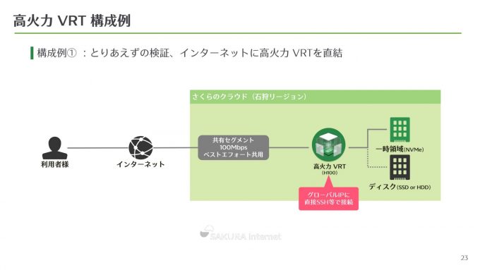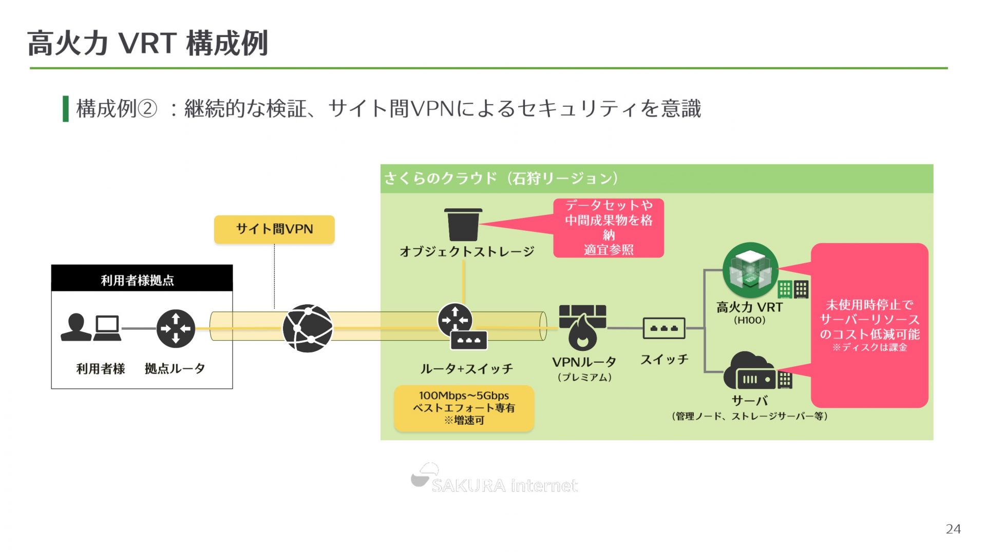 高火力 VRTの特徴を一言で説明すると「1GPUを専有できるセキュアで明朗会計な国産GPUクラウドサービス」となります。当社のクラウドサービス「さくらのクラウド」と同様の料金体系になっており、データ転送量による課金がないとか、月額費用の上限が決まっているといった特徴を引き継いでいます。GPUはNVIDIA V100とH100の2種類を用意しています。H100プランには通常のストレージ(SSD)の他に6.9TiBの一時領域(電源を切らない限りデータが保持される)も用意されており、例えばここに大量のデータを載せて学習に利用することができます。