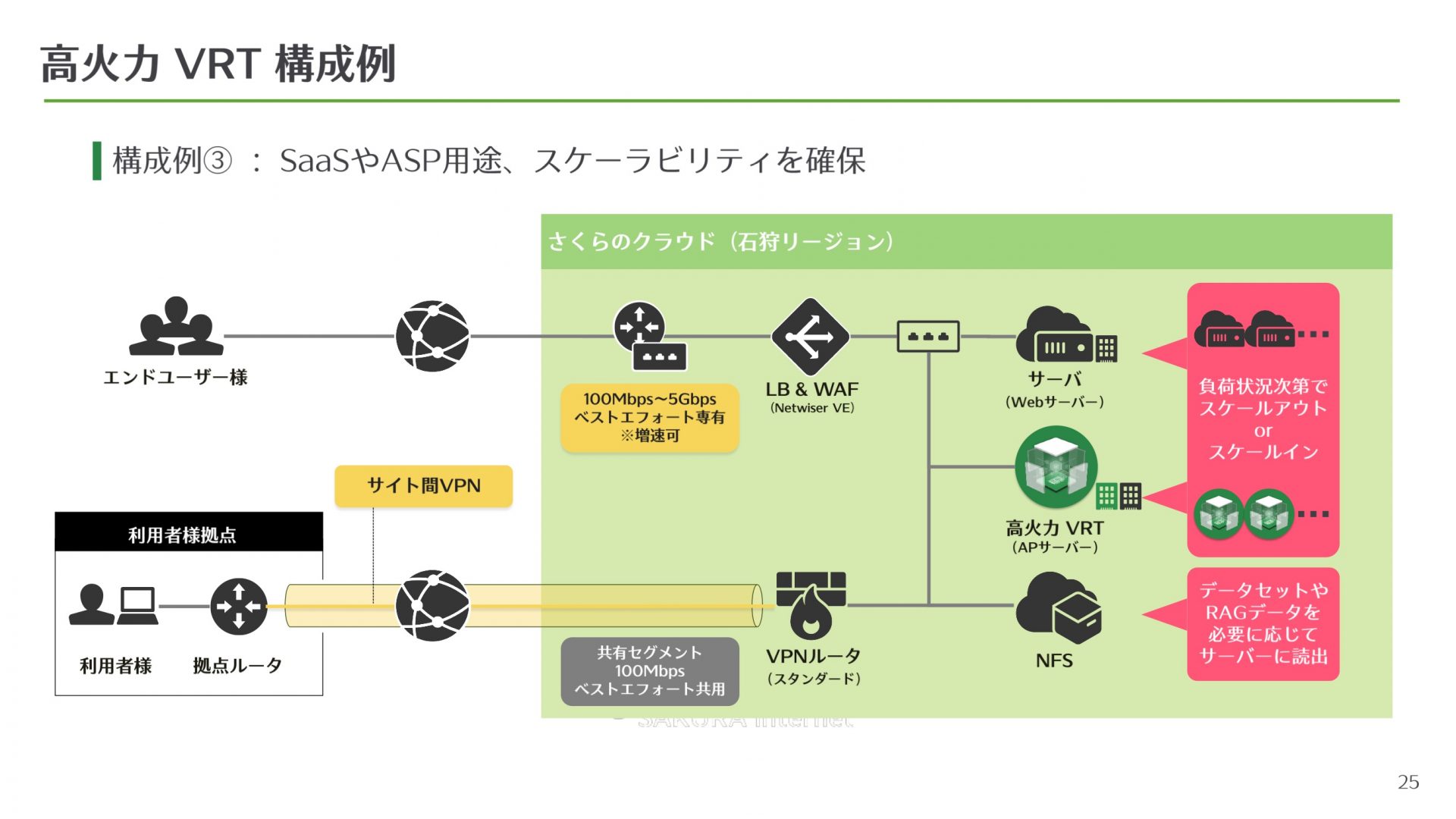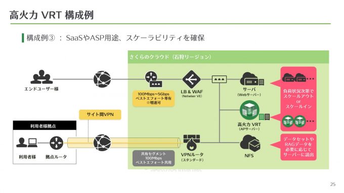 高火力 VRTはさくらのクラウドとシームレスに接続できるので、クラウドのさまざまなリソース(スイッチ/ロードバランサ/データベースなど)と組み合わせて、多種多様な構成のシステムを組むことができます。村元からはシンプルなインターネット直結の構成からスケーラビリティを確保した複雑な構成まで、3種類の構成例が提示されました。