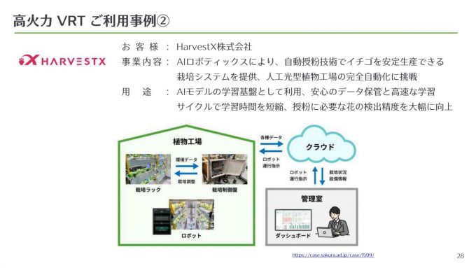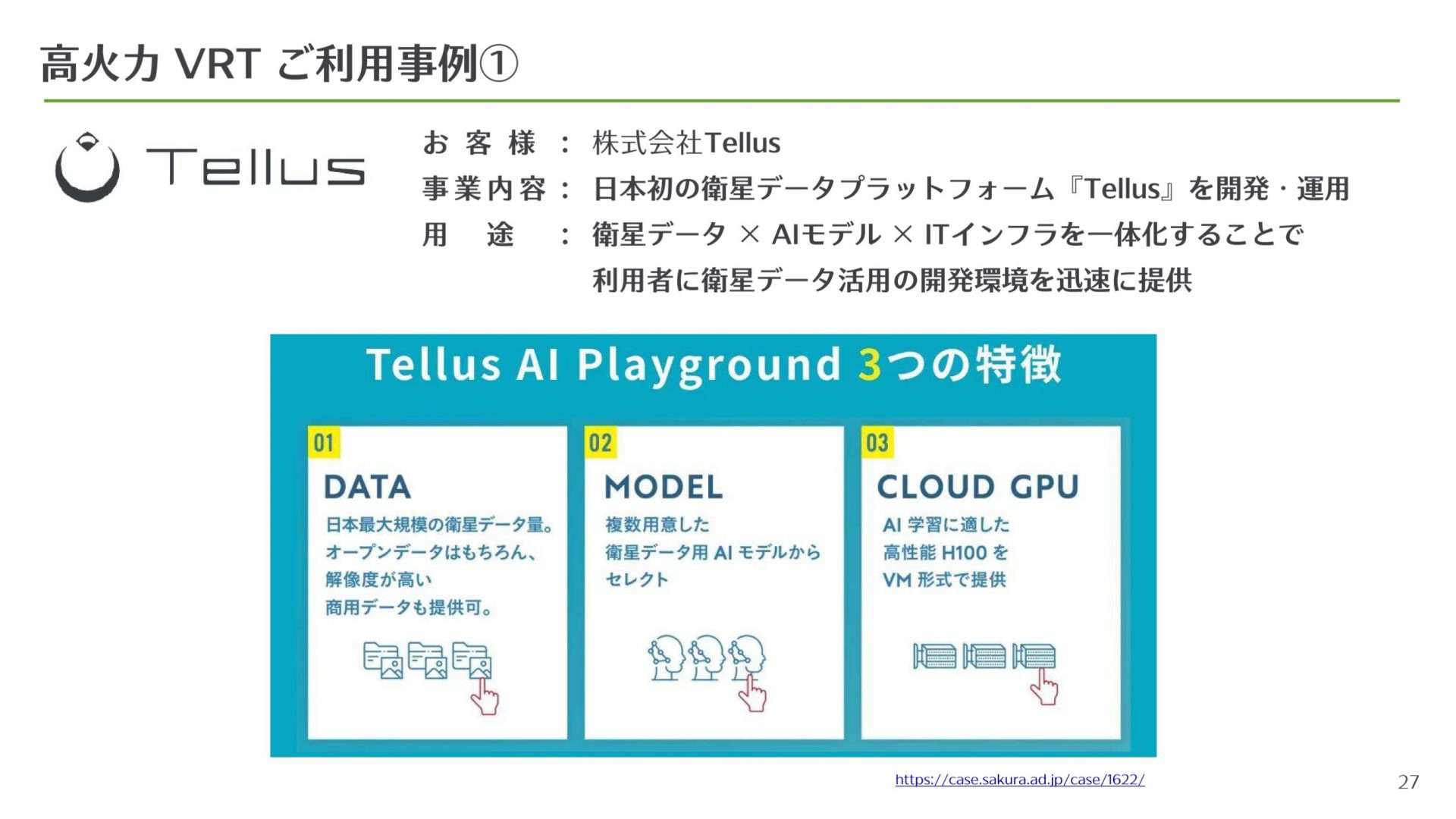 また、代表的な利用事例が2つ紹介されました。1つは当社のグループ会社でもある株式会社Tellusの事例で、衛星データとAIモデル、ITインフラを一体化させた「Tellus AI Playground」の基盤として高火力 VRTのH100プランを利用しています。もう1つはHarvestX 株式会社の事例で、イチゴの自動授粉における画像解析に高火力 VRTを利用しています。