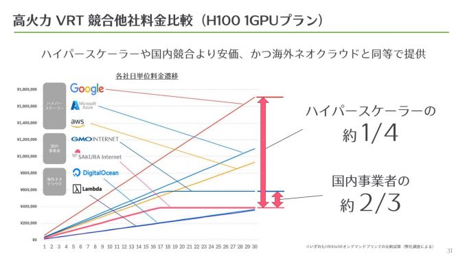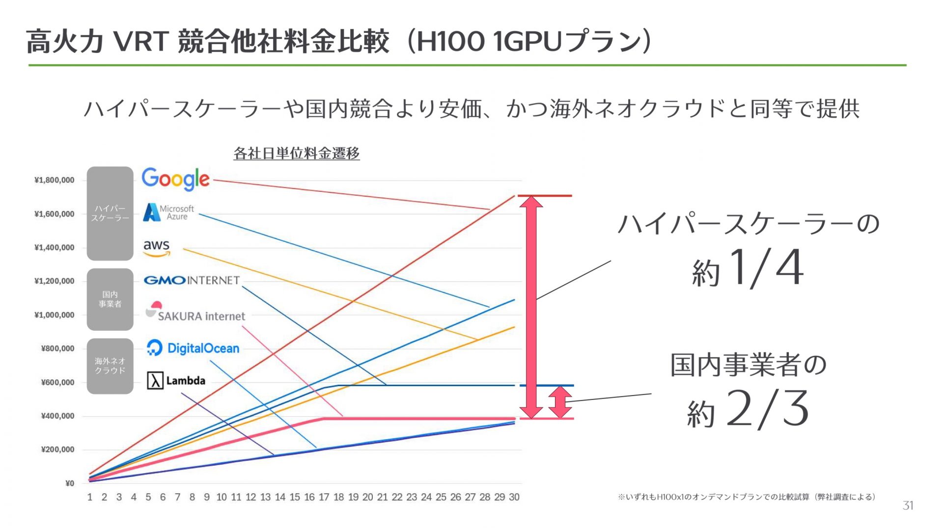 最後に高火力 VRTの料金プランと、それに加えて他社のGPUプランとの比較表も提示されました。海外のハイパースケーラに対しては約1/4、国内の他事業者に比べても約2/3程度の価格で利用できるとのことです。