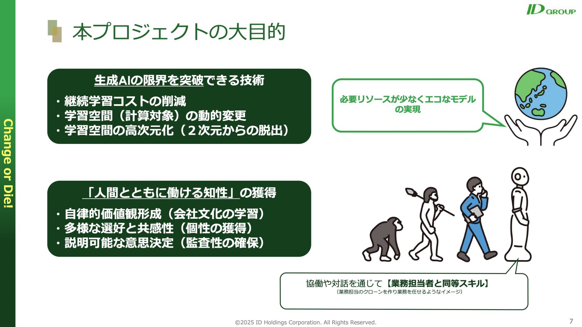 はじめに現在の生成AIが持つ課題や限界が提示されました。学習やチューニングなどの調整作業が継続的に発生し負荷が小さくないこと、答えは出せても、その答えがどういう過程を経て出てきたのかが見えにくいこと、現場ごとの暗黙知や価値観、組織文化のようなものを継続的に学び続けるのが不得意なことなどです。