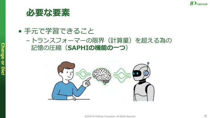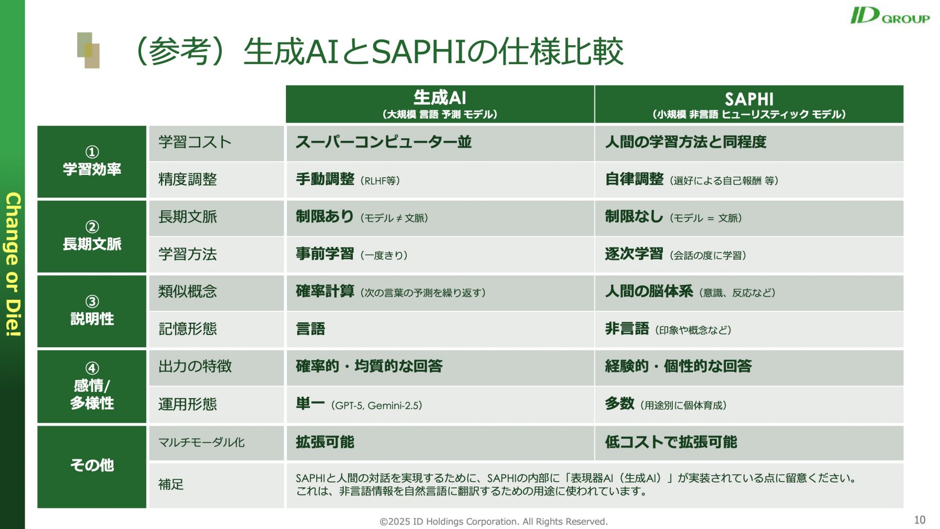 そんなSAPHIの大きな特徴の一つが継続学習です。従来のAIはまず大量に学習させ、それから個別用途に合わせて調整していきます。これに対してSAPHIは、会話や業務の中で少しずつ経験を蓄積しながら更新していくという逐次学習を重視しています。人間も毎日フルスクラッチで学び直しているわけではなく、日々の経験の中で成功や失敗を蓄積していきますが、SAPHIはその学び方に近いと言えます。従来の生成AIとSAPHIを比較した表を以下に提示します。