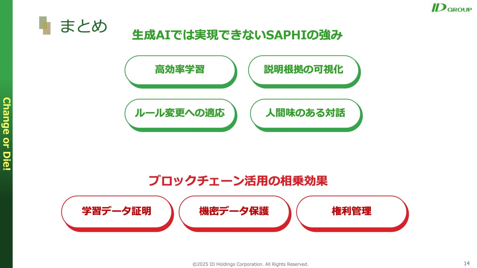 最後に今後の発展性として、フィジカルAIへの応用や、ブロックチェーンなどの記録基盤との組み合わせによる学習や判断の証跡記録といった可能性が示されました。