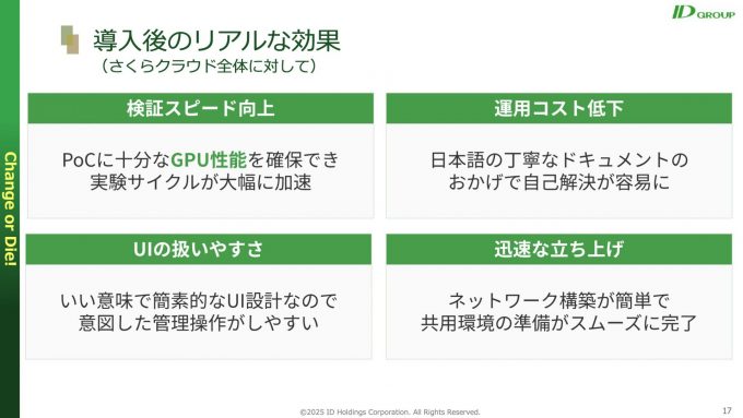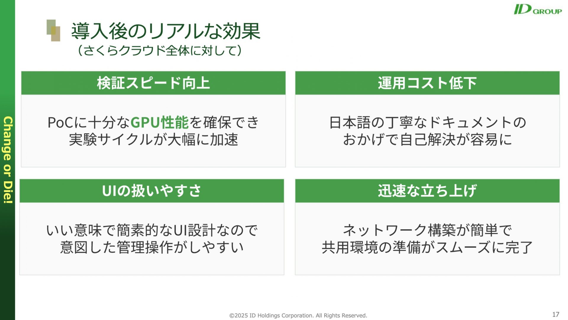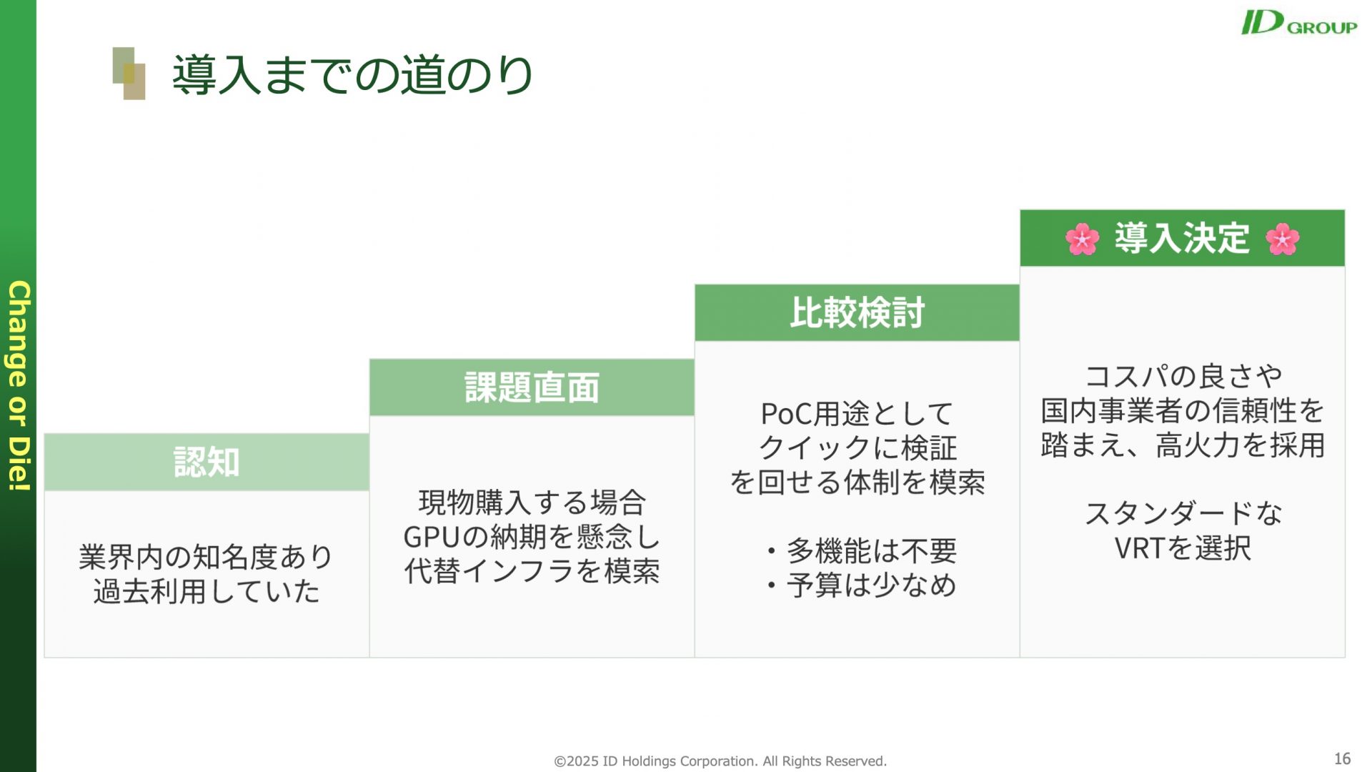 SAPHIの開発においてリソース面で問題となっていたのは、GPUがなかなか手に入らないことでした。SAPHIはまだ研究開発の段階なので、新しいアイデアをすぐに検証できることが重要です。エンジニアがクラウド基盤の細かい設定に時間をかけることなく本来の開発に集中できるように、手早く利用できるGPU基盤を探したところ、さくらインターネットの高火力 VRTに出会いました。導入決定につながった要因は、コストパフォーマンスの良さ、国内事業者としての信頼性、それからさくら社員の回答の早さだそうです。