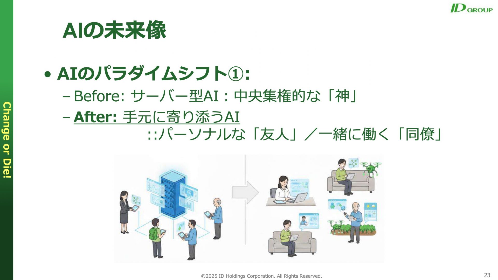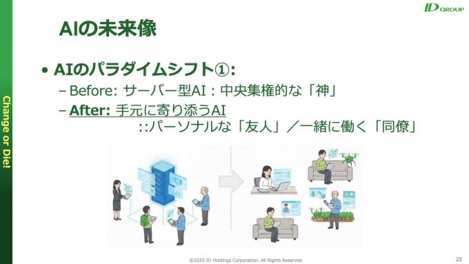 このような状況の中で生永さんが考えるAIの未来像は、従来の中央集権的なAI(1か所にあるすごく賢いAIサービスに対して質問し答えてもらう)から、ユーザの手元に寄り添うAIへのパラダイムシフトです。また、学習データが枯渇し、データそのものの価値が上がるという予想もしています。現在でも音声データをはじめとして専門的なデータを提供するサービスやマーケットプレイスが出現していることが根拠です。