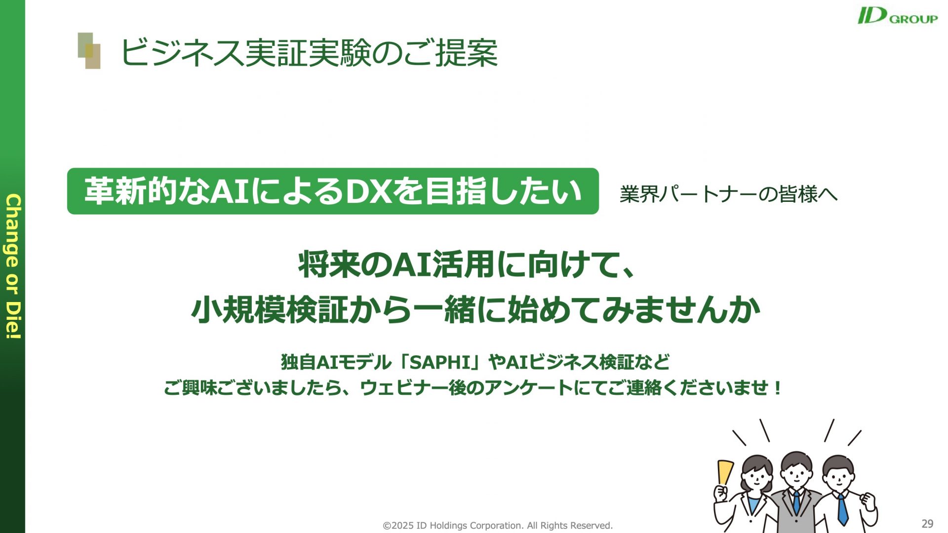 最後に今後のSAPHIの開発目標として、学習記録をすべて残すAIとしてサービス提供できるレベルまで引き上げること、常に継続学習ができる点をビジネス価値として創出すること、データ取引に決済機能を組み込み、リソースを自己管理できるAIに発展させることを掲げました。ビジネス実証実験も実施したいので興味のある方は連絡をくださいとのことです。